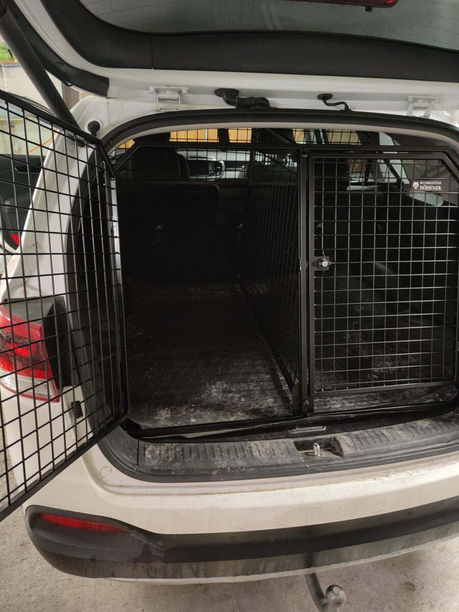 Des Rätsels Lösung ist eine neue Türe, die wir an einem festen, unbeweglichen Stück angeschlagen habe. Die bereits vorhandene Trennwand haben wir um genau die Breite des fixen Stückes nach rechts verschoben, was die gewünschte Aufteilung von einem Drittel und zwei Drittel ergeben hat. Da die vorher genutzte Türe noch vorhanden ist, können Claudia und Benno jederzeit die neue Türe mit dem festen, unbeweglichen Stück entfernen und die vorherige wieder einhängen. Danach müssen sie nur noch das Trenngitter zur Halbierung des Kofferraumplatzes zurückschieben.